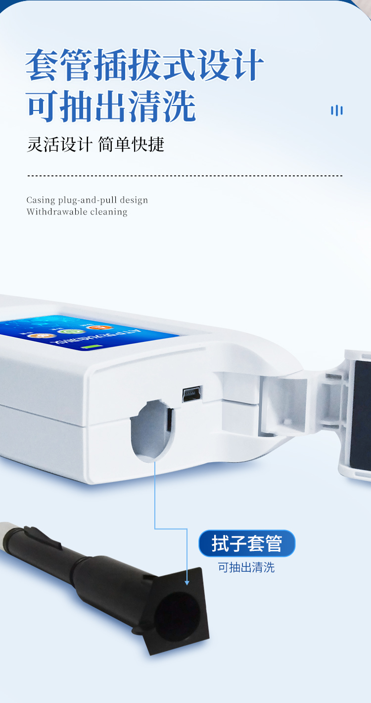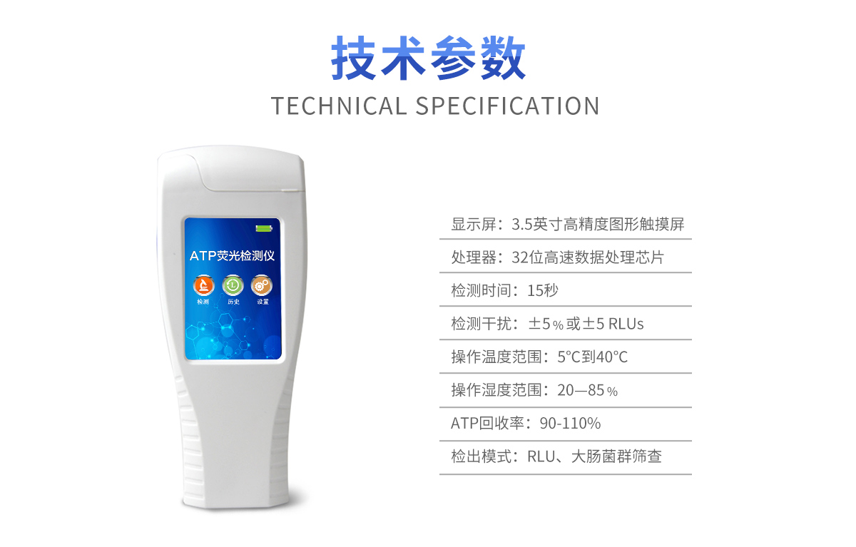该设备为全新升级产品,大屏幕触摸显示屏,代替传统按键。操作采用生物化学反应方法检测ATP含量,ATP荧光检测仪基于萤火虫发光原理,利用“荧光素酶—荧光素体系”快速检测三磷酸腺苷(ATP)。ATP拭子含有可以裂解细胞膜的试剂,能将细胞内ATP释放出来,与试剂中含有的特异性酶发生反应,产生光,再用荧光照度计检测发光值,微生物的数量与发光值成正比,由于所有生物活细胞中含有恒量的ATP,所以ATP含量可以清晰地表明样品中微生物与其他生物残余的多少,用于判断卫生状况。